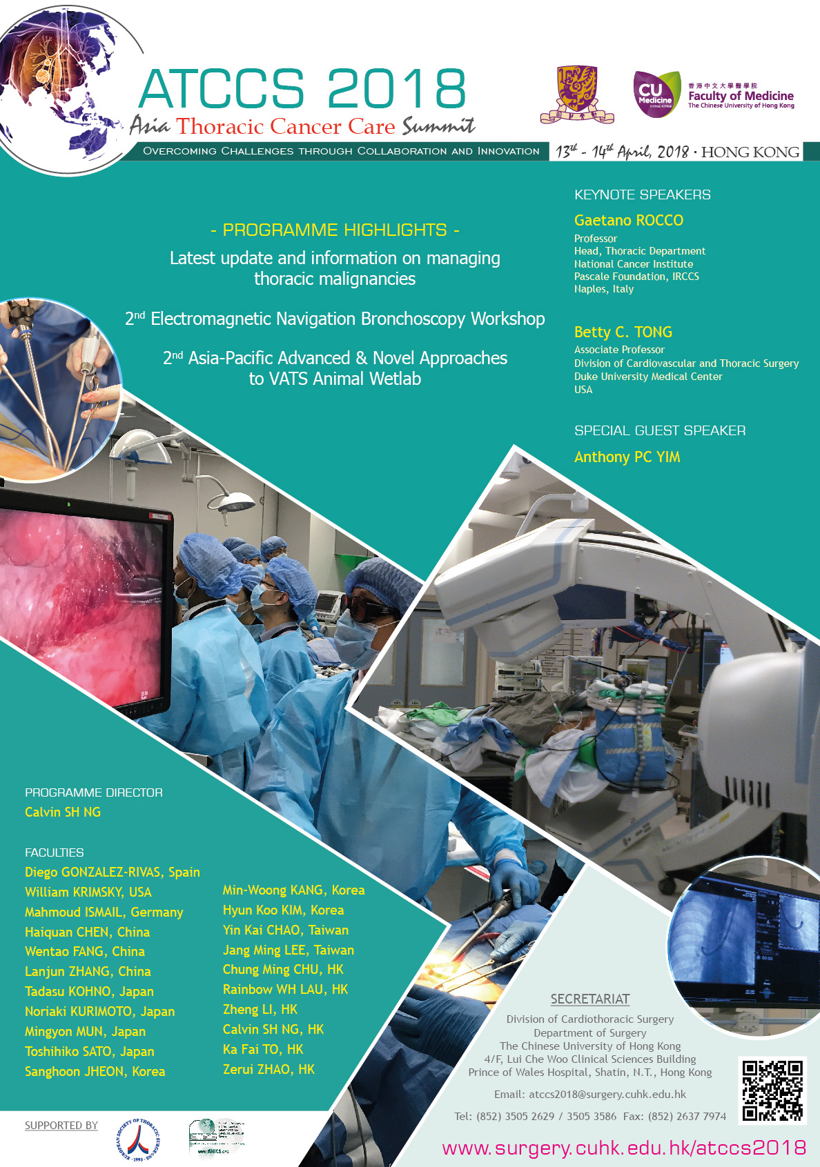 “ATCCS is organized by the Division of Cardiothoracic Surgery, Department of Surgery, The Chinese University of Hong Kong which will take place in Hong Kong on 13 - 14 April, 2018. The theme of the meeting is “Overcoming Challenges through Collaboration and Innovation”. Leading institutes in the world from US, Europe and throughout Asia will participate in this meeting. Participants will gain the most d information on thoracic malignancy management through lectures and discussion. The Electromagnetic Navigation Bronchoscopy Workshop and the VATS Workshop are also the highlights of the Event. We believe delegates will find it an informative and inspirational programme which is fruitful to attend.”