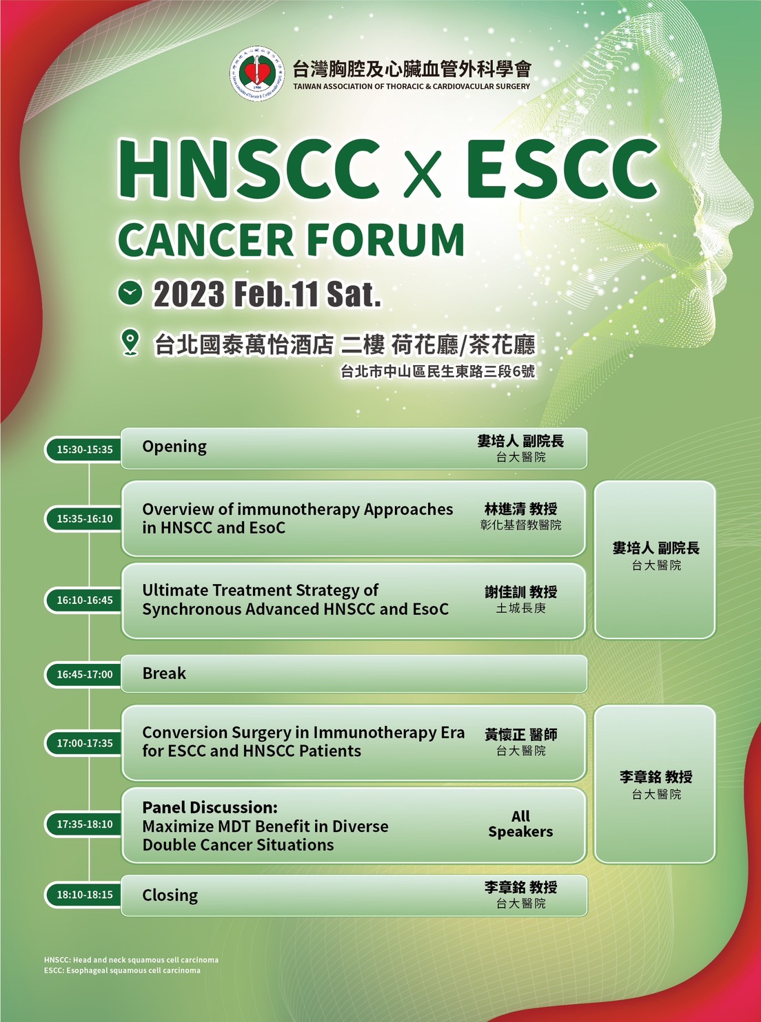 本會於111/2/11主辦Esophageal & HNSCC Double Cancer Forum(實體會議),本會給予積分20分。因有人數限制需事先報名,報名資訊如下,敬邀踴躍報名!