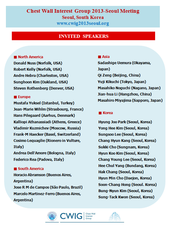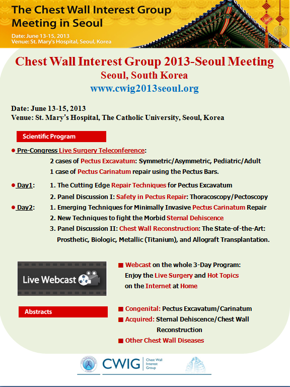 On behalf of Chest Wall Interest Group (CWIG) Korea, I would like to introduce our meeting, the "Chest Wall Interest Group 2013-Seoul Meeting (CWIG2013-Seoul) on June 13-15, 2013.”