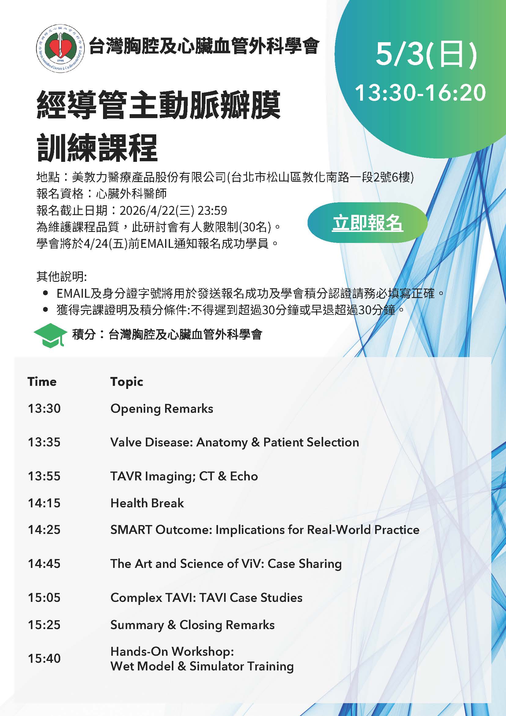 本會將於5/3下午舉辦『經導管主動脈瓣膜培訓課程』。本會給予此活動學術教育積分20分, 報名資訊如下,敬邀踴躍報名。