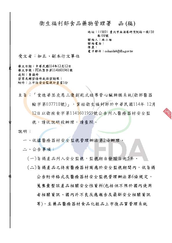公文-愛德華瑟皮恩三優創乾式經導管心臟瓣膜系統列入醫療器材安全監視