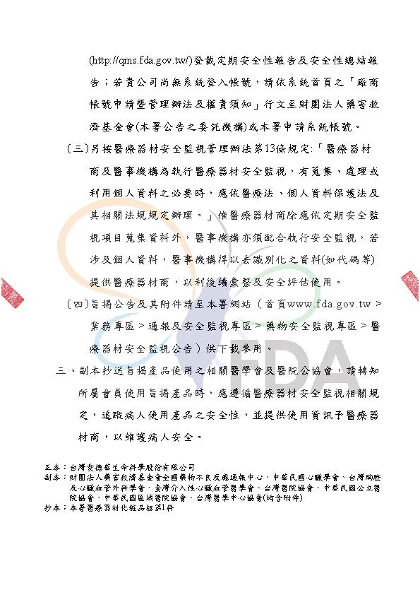 代公告-愛德華瑟皮恩三優創乾式經導管心臟瓣膜系統列入醫療器材安全監視